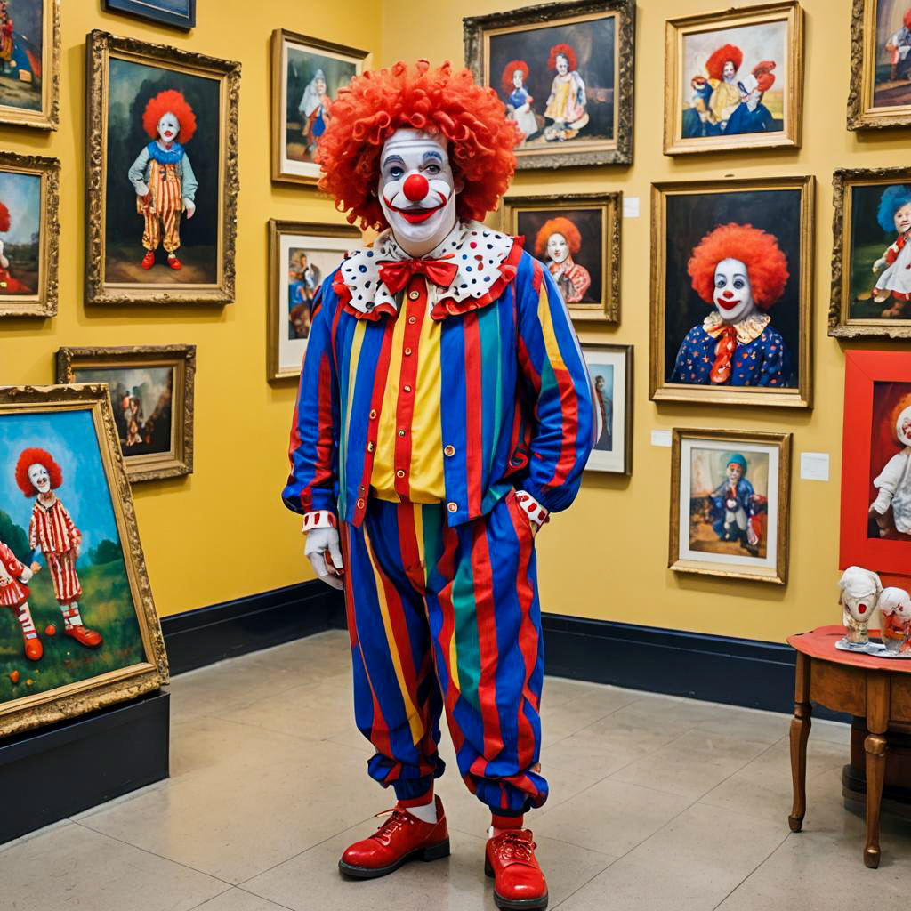 Photo of a Proportionate Body person, Bowling Ball Cut, clown outfit, colorful and oversized with polka dots and stripes, bright red nose, curly wig, ruffled collar, striped pants, colorful shoes, Cerulean Polyester, Photo studio, dreamlike atmosphere