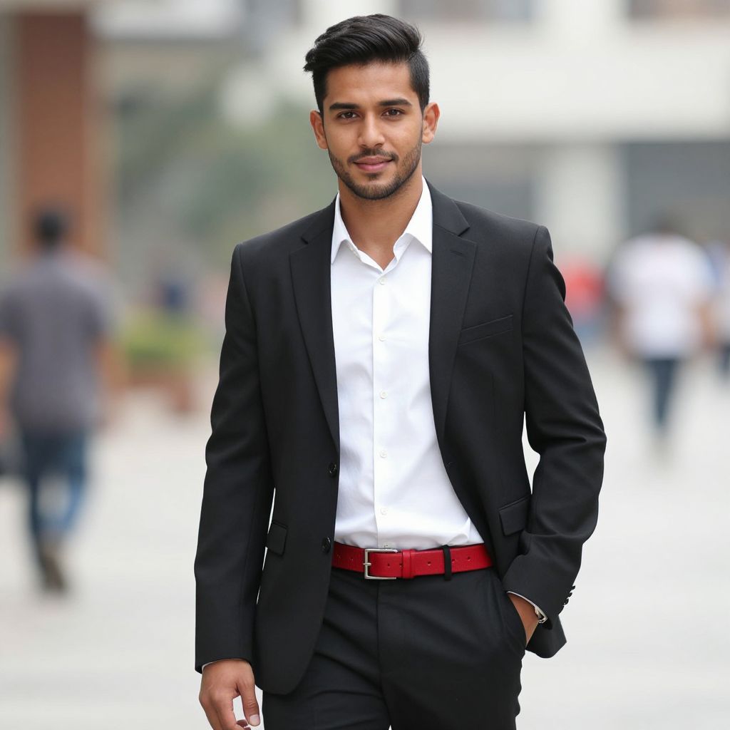 Usa costume, 1boy, male focus, belt, shirt, jacket, hand in pocket, looking at viewer, pants, blurry, outdoors, black hair, collared shirt, blurry background, red belt, black jacket, black eyes, black pants, realistic, short hair, belt buckle, standing, smile, solo focus, day, suit, white shirt, open jacket, open clothes, facial hair