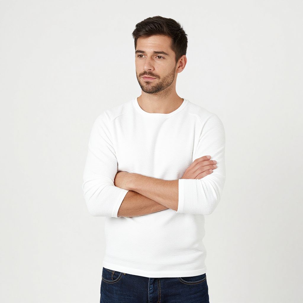 Photograph of a casual-looking man standing against a plain white background. He has short, dark brown hair, a light beard, and is wearing a white, long-sleeved, ribbed shirt with dark blue jeans. His arms are crossed, and he's looking slightly to the left with a neutral expression. The image is brightly lit, making the white background and his shirt stand out prominently.