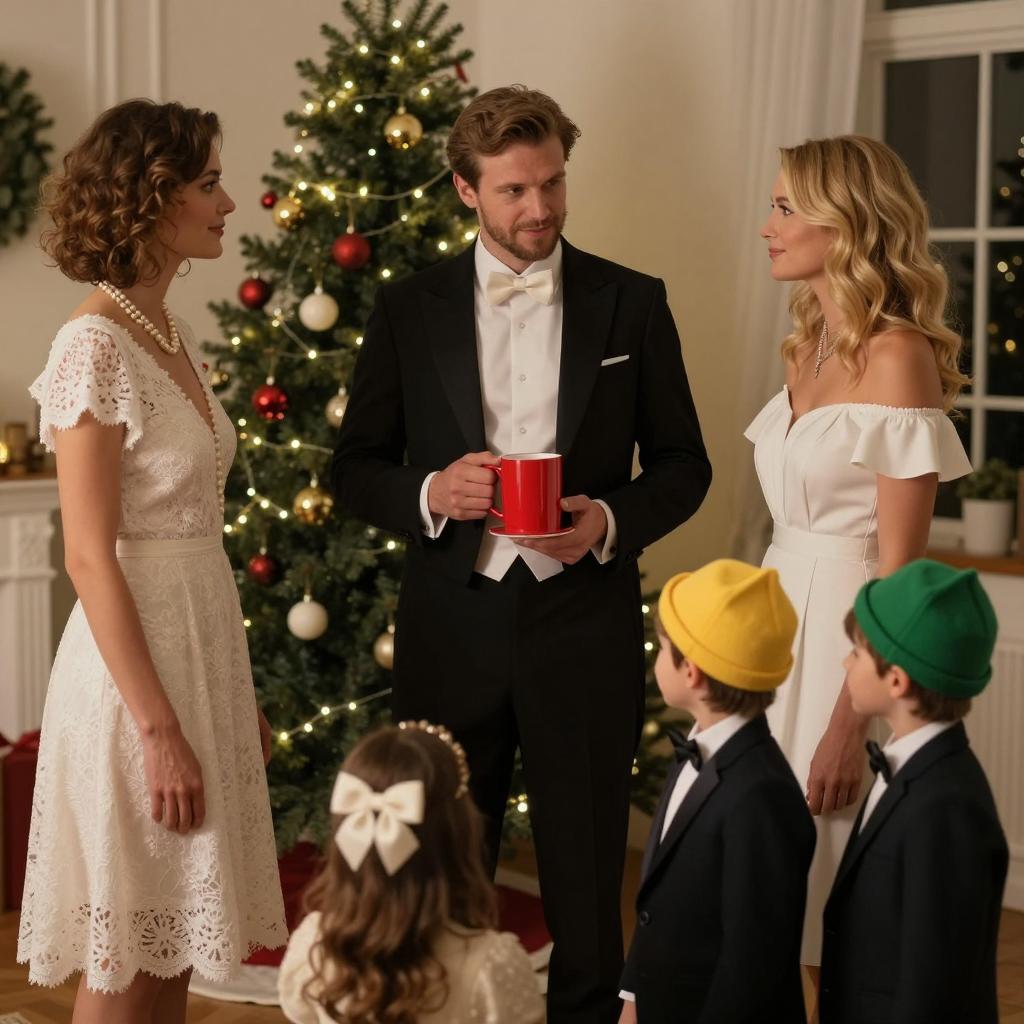 Photograph of a smiling man and woman standing back-to-back, wrapped in red ribbons from chest to feet. The man, with short brown hair and a black turtleneck, stands on the left, while the blonde woman in a black dress stands on the right. Both have black shoes. Stacked green and red gift boxes with gold ribbons are at their feet. The background is white and blurred, with shallow depth of field. Lighting is even, with no shadows. Camera angle is straight-on.