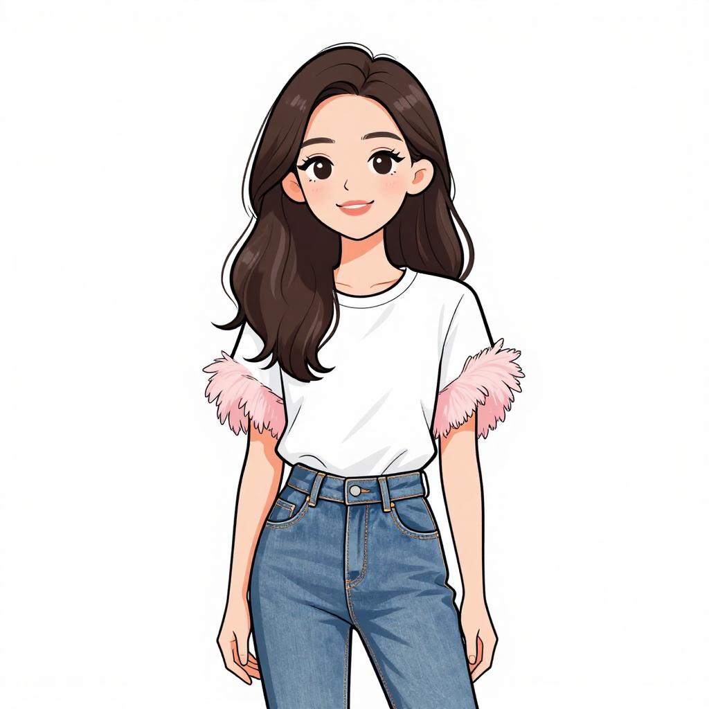 Woman with pretty face and pretty hair. smiling Woman, playful casual, classic white crewneck t-shirt with pink feather details on the sleeves, high-waisted blue denim jeans with a light wash, straight leg, standard five-pocket design, simple silver belt buckle, white background. --sref 1467