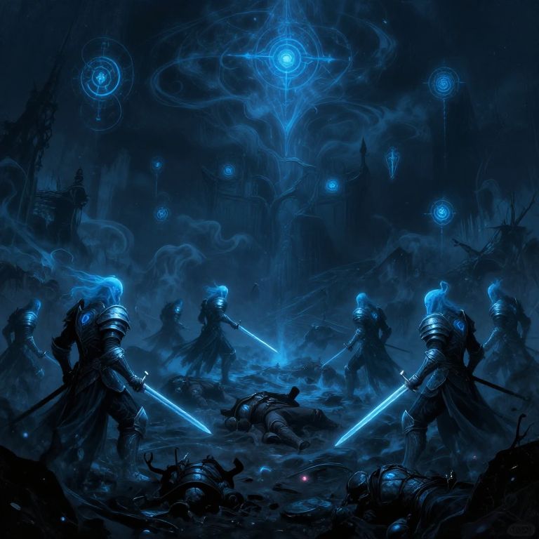 Fantasy battle scene: Blue-armored warriors with glowing swords clash in a dark, misty forest under a mystical, ethereal blue sky. Digital