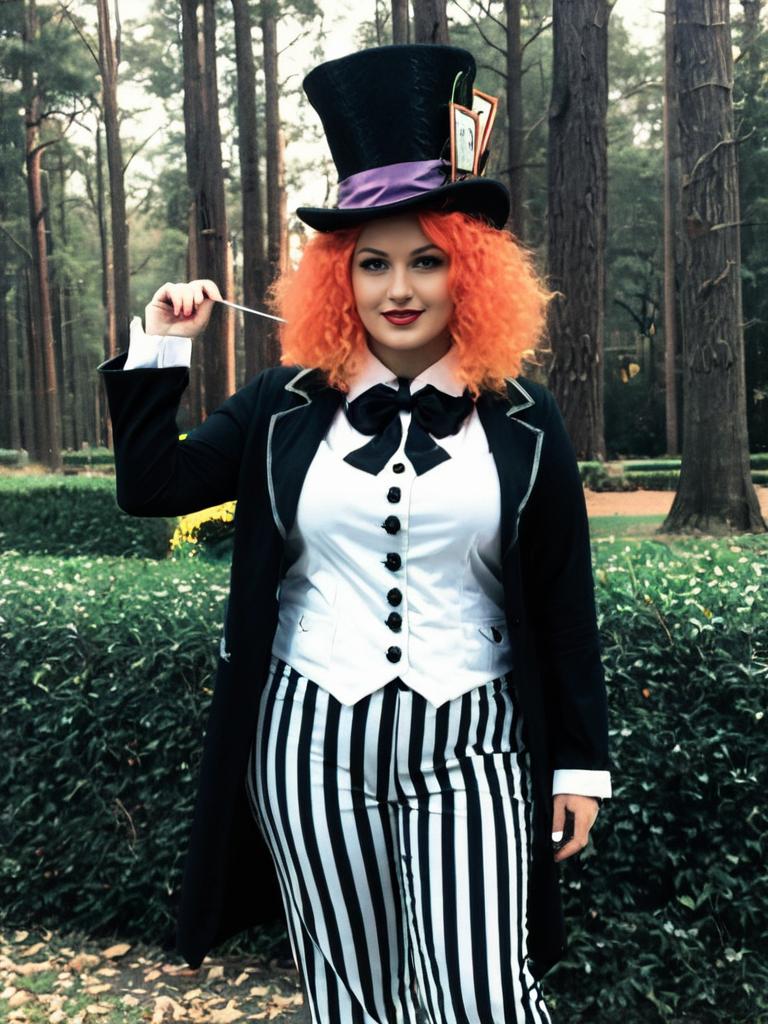 Plus Size Adult Mad Hatter Costume, woman in a top hat and striped pants