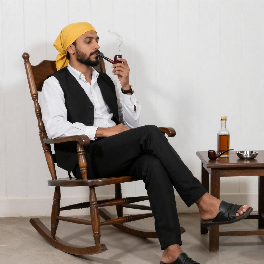 Man with a yellow headscarf, white shirt, black vest, and black pants sits in a wooden rocking chair smoking a pipe. White wooden wall background. Small table with a glass bottle, pipe, and ashtray on the right. Casual, relaxed pose.