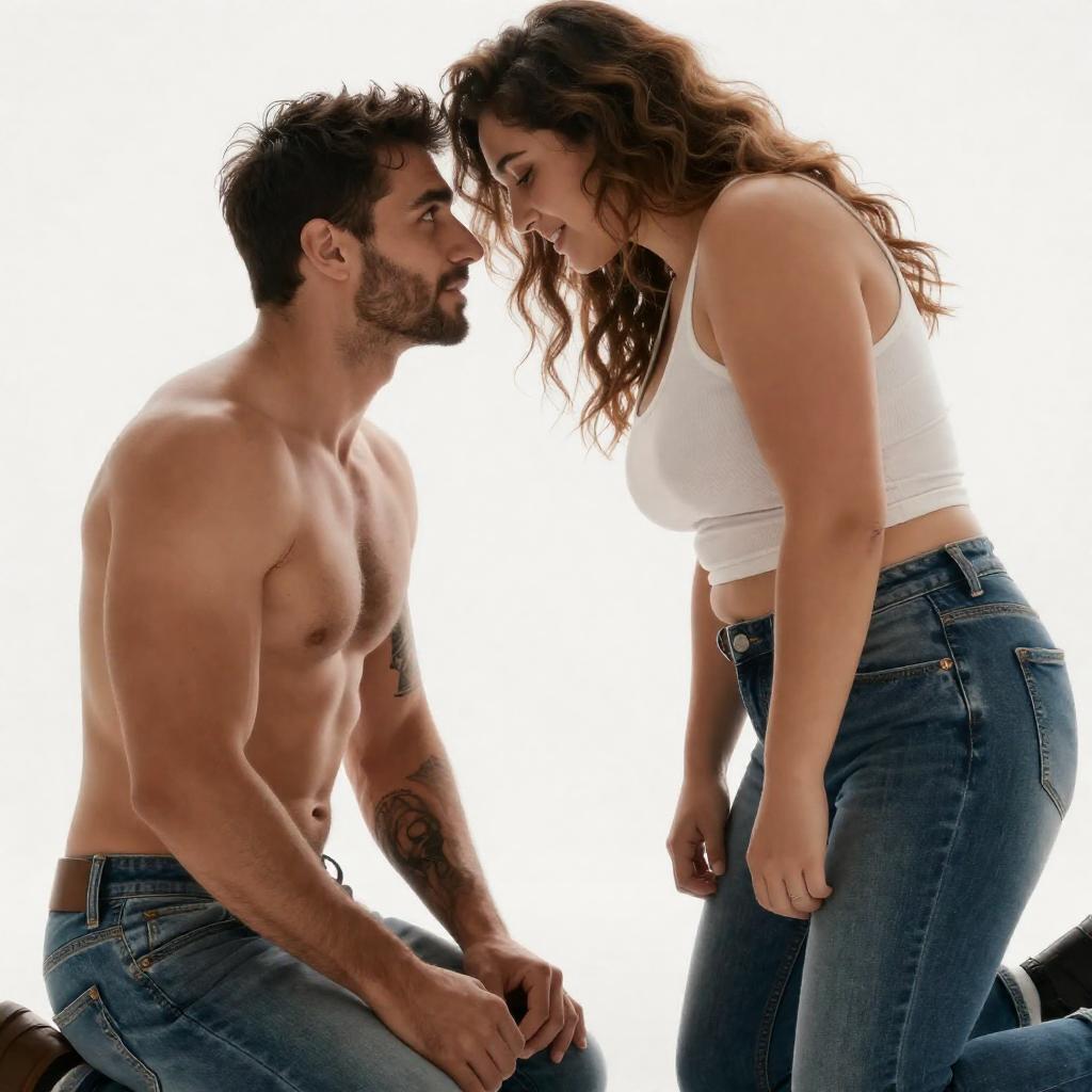 Photograph of a passionate scene with a muscular man with dark hair and tattoos, kneeling and unbuttoning the jeans of a curvy woman with long, wavy brown hair and a white tank top. She leans forward, her face close to his, as he looks up at her. Bright, backlit background.