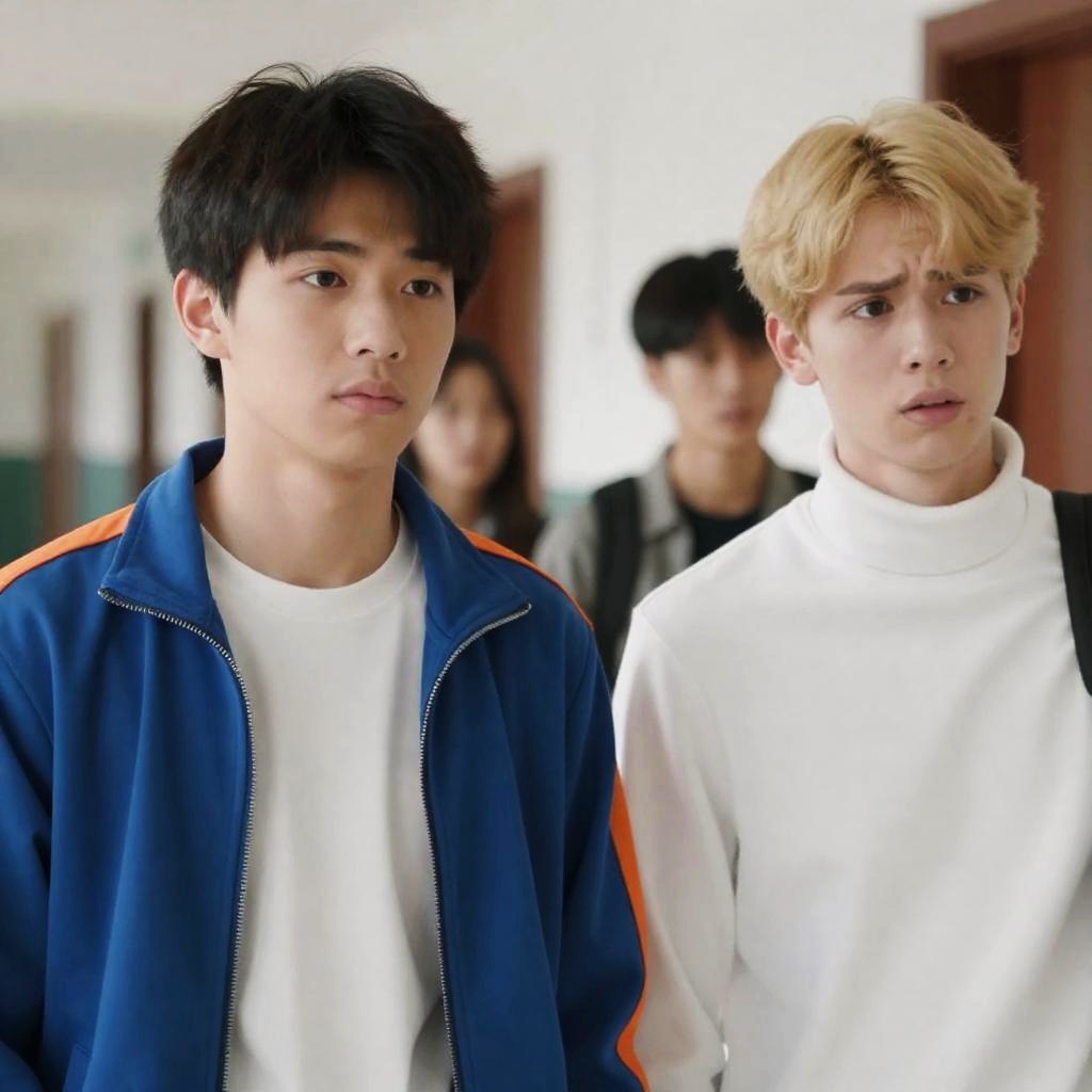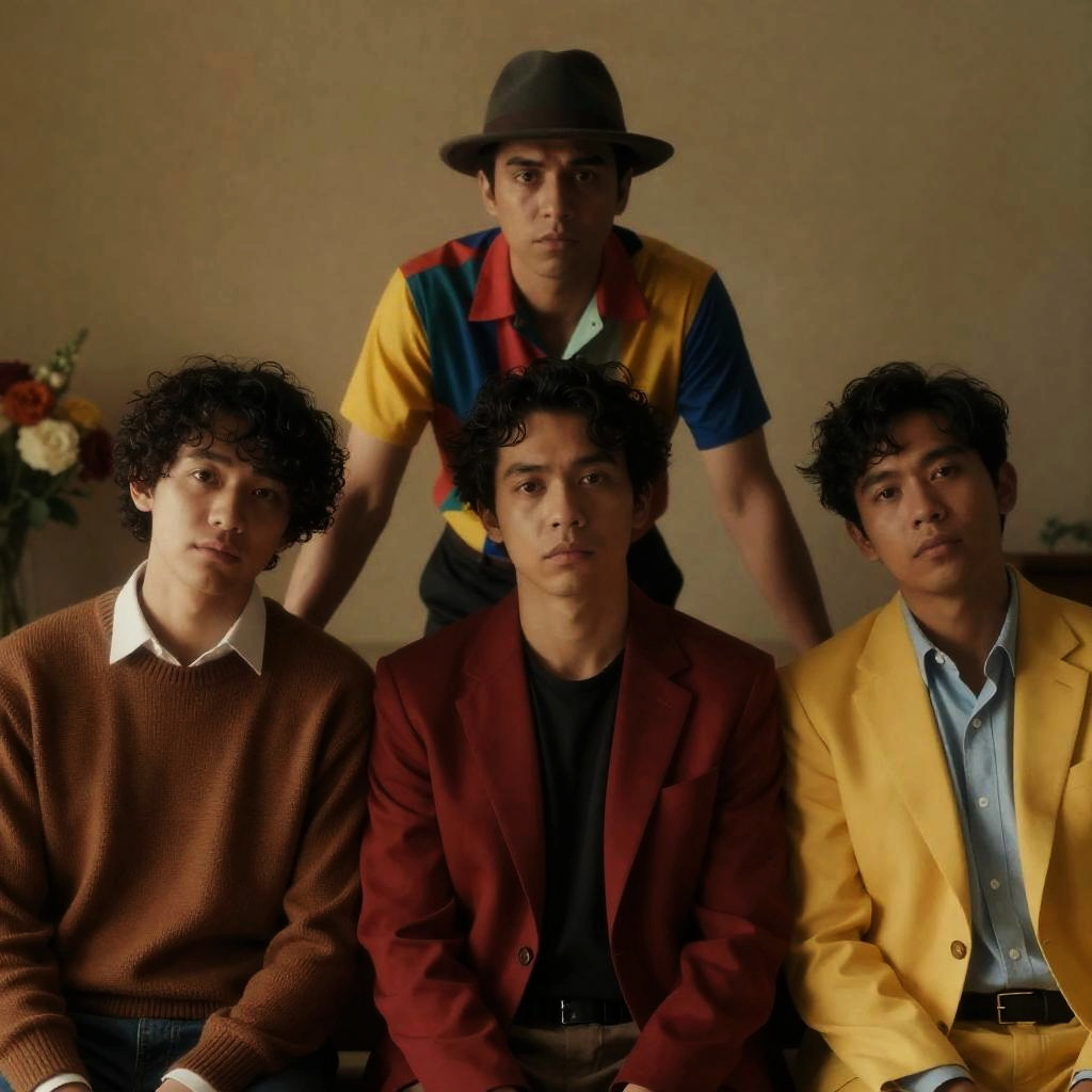 Photograph of four young men standing closely together indoors. The man on the left has short, curly blonde hair, wears a white t-shirt with abstract designs. The man in the center wears a red jacket with a triangular patch, black hair, and arms crossed. The third man, with dark hair and glasses, wears a brown scarf and brown jacket. The man on the right has dark hair, wears sunglasses, and a denim jacket with a red button. Background includes pink posters and another person in the distance. All men have neutral or serious expressions.