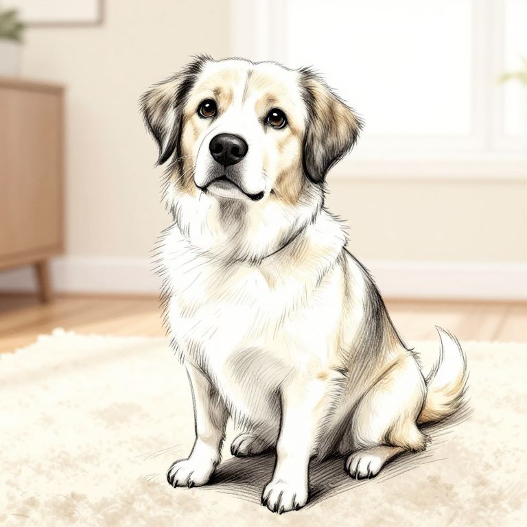 Drawing of a dog sitting patiently with a tilted head, expressive eyes full of curiosity, sketch style with fine lines and shading, cozy indoor setting with a rug and a window, warm and inviting atmosphere