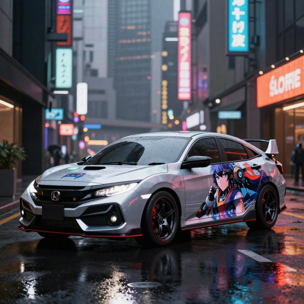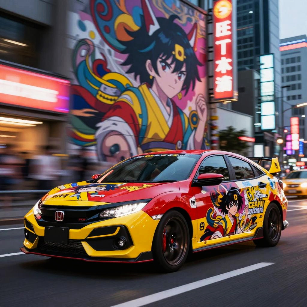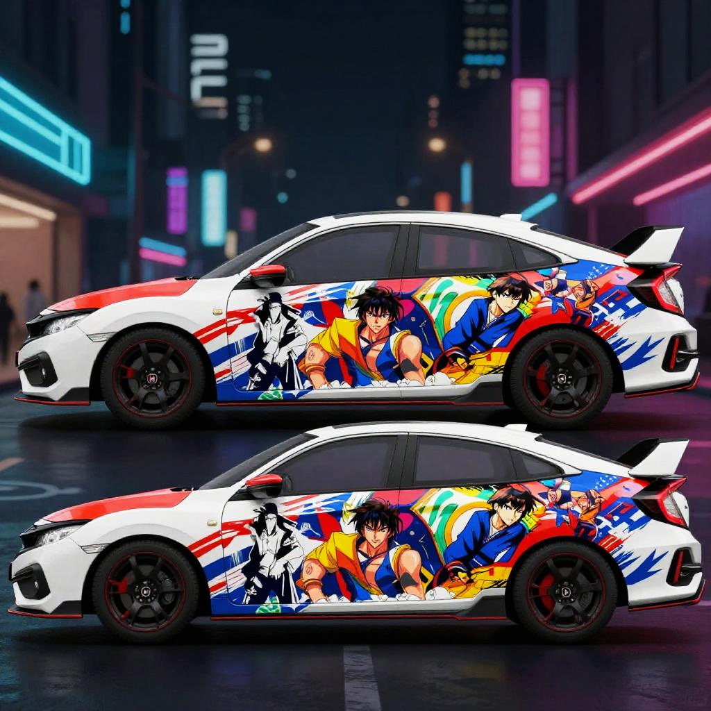 Honda Civic anime wrap design featuring vibrant, dynamic characters and bold, colorful patterns inspired by traditional and modern anime styles, set against a sleek car silhouette, high detail and urban street background, neon lighting effects.