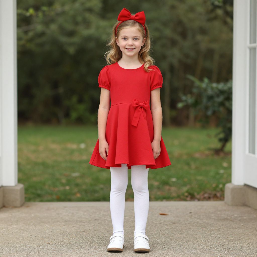 Photograph of a young girl with wavy blonde hair, wearing a red dress, white leggings, white shoes, and a red bow headband,