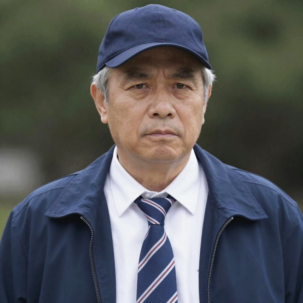 Middle-aged man with fair skin, gray hair, and serious expression, wearing a navy cap, blue jacket, white shirt, and striped tie. Blurred green background. Upper body focus. Neutral lighting. Casual attire. One person.