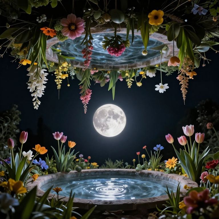 This digital artwork depicts a nighttime garden scene with two circular stone water basins, each adorned with a variety of colorful flowers including tulips, daisies, and roses. The basins are illuminated by a bright, full moon in the dark sky, casting a reflective glow on the water's surface. The flowers, in vibrant hues of pink, yellow, blue, and white, hang from the top basin and surround the bottom one, creating a lush, floral frame. The scene is richly detailed with textures of petals, leaves, and water ripples, evoking a tranquil, magical atmosphere.
