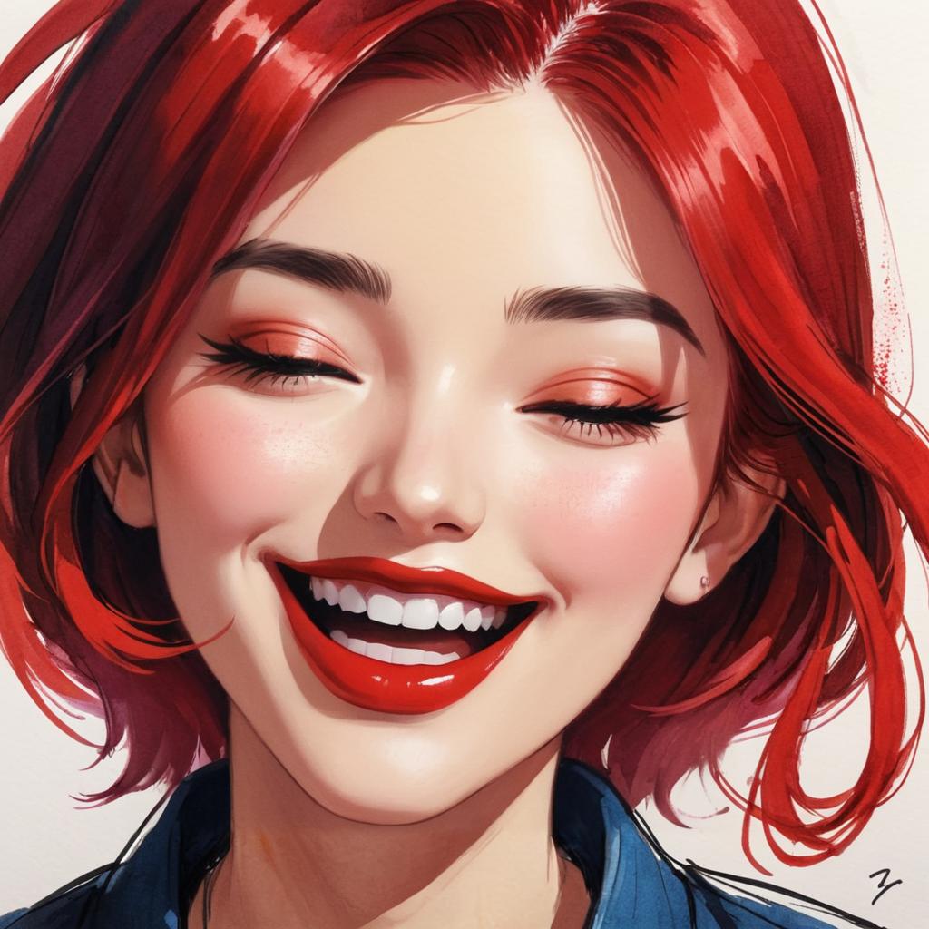 Solo, traditional media, sketch, abstract, open mouth, colorful, 1girl, red hair, 1boy, smile, portrait, lipstick, black hair, makeup, long hair, closed eyes, painting (medium), male focus, red lips, looking at viewer, upper body