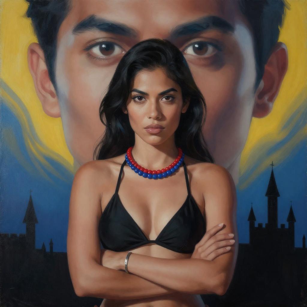 Painted image of a woman with long black hair, crossed arms, wearing a black bikini top, red and blue necklace, and silver bracelet. Large shadowy male face with wide eyes in background. Yellow and blue streaks in sky. Dark castle silhouette at bottom right. Woman's intense expression.