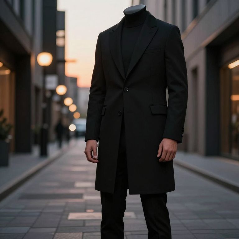 A sleek black coat suit standing in a modern urban alley at sunset, sharp silhouette against glowing streetlights, subtle shadows, detailed fabric texture, cinematic lighting, photorealistic style, Flux style.