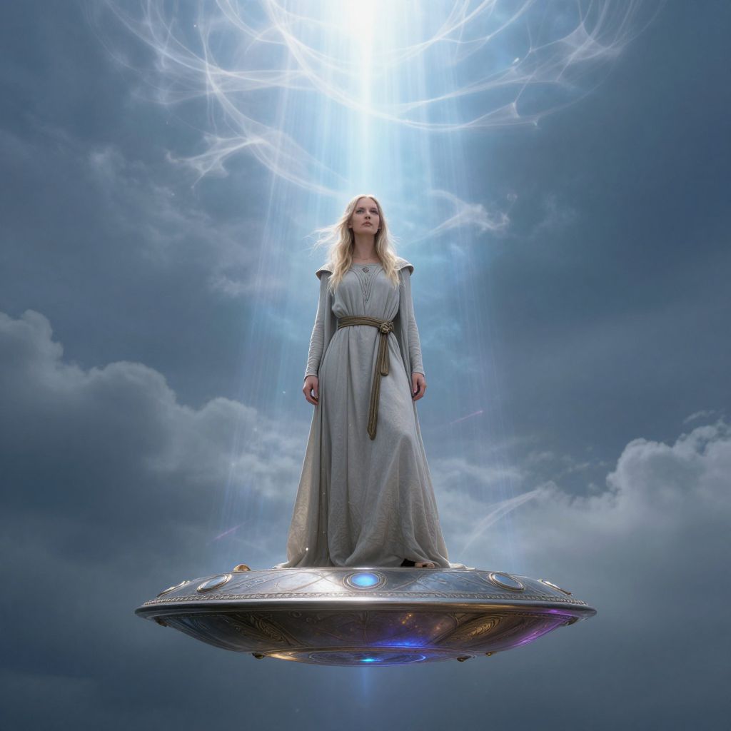 A robed woman stands on a floating disc in a fantastical, ethereal sky, with an ethereal light emanating from above, reminiscent of the Forgotten Realms.