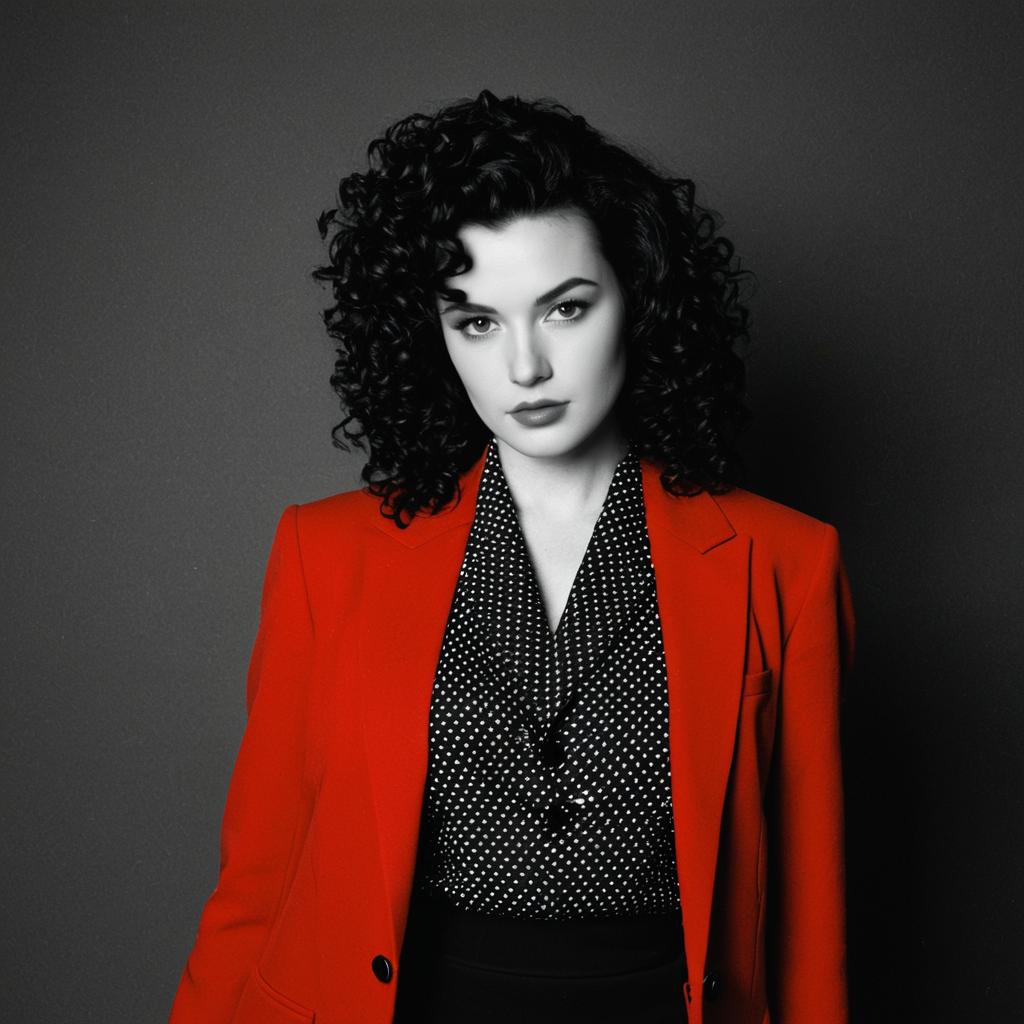 Girl #39 cosplay, Girl 6 Debi Mazar, vintage 1990s inspired outfit, red fitted blazer, curly black hair, bold makeup, monochrome background