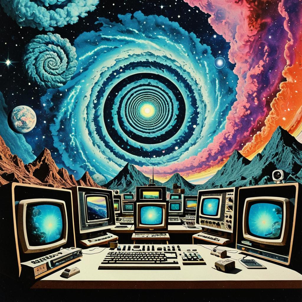 A surreal psychedelic collage featuring vintage computers and televisions displaying swirling galactic nebulae and cosmic spirals. The eclectic artwork blends 1970s sci-fi aesthetics with retro-futuristic technology set against a cosmic landscape filled with mountainous terrain and vibrant nebula clouds. The composition combines archaic computer equipment, psychedelic patterns, and outer space imagery to evoke a nostalgic yet otherworldly atmosphere.