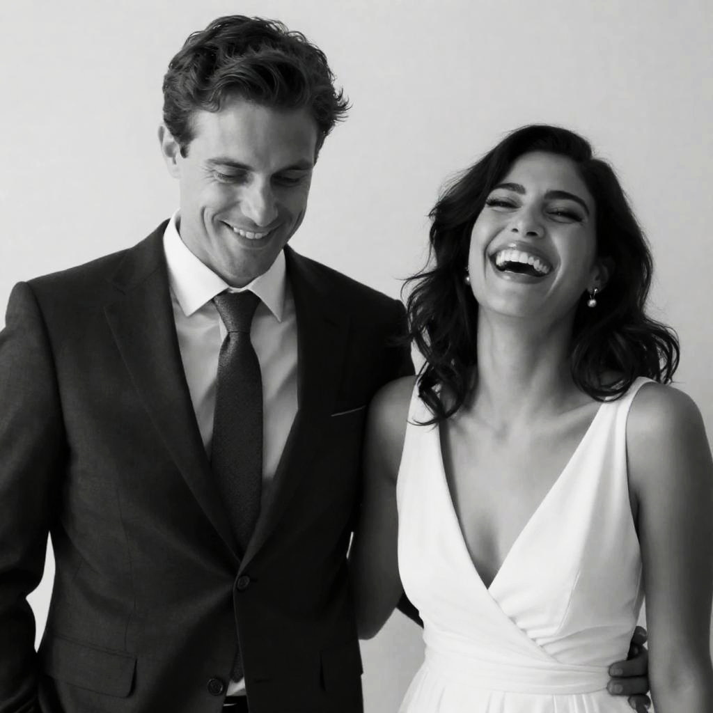 Black-and-white photograph of a man and woman. Man in dark suit with white shirt and tie, short dark hair, looking down smiling. Woman with dark, wavy hair, wearing a low-cut white dress, laughing with head tilted back. Background has a plain wall. Man on left, woman on right. Both smiling.