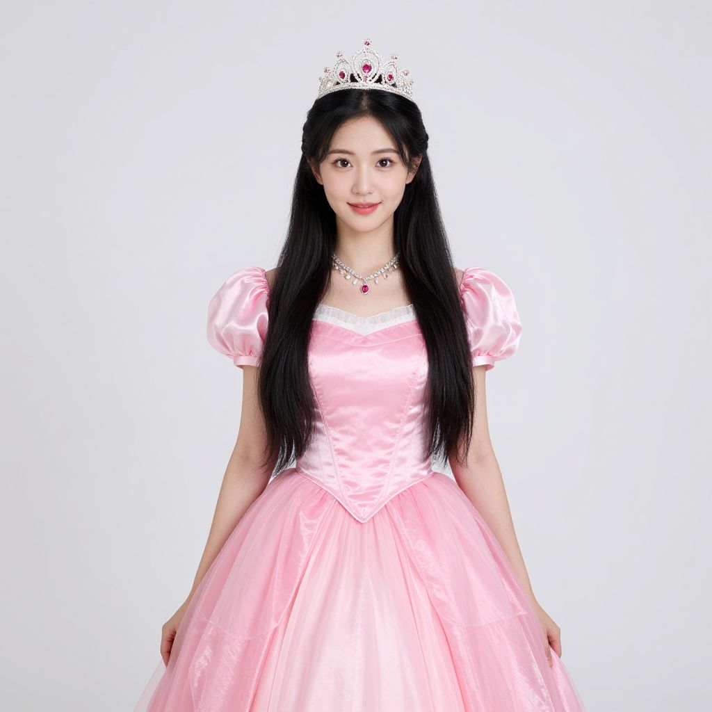 Photograph of an East Asian woman with long black hair, wearing a pink satin princess dress, puffed sleeves, and a silver tiara, against