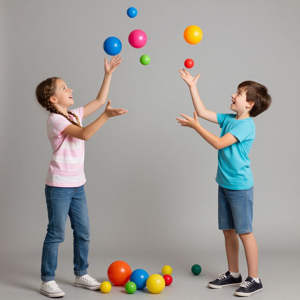 Two children joyfully toss and catch a vibrant array of colorful balls, creating a dynamic display of playful interaction as the spheres scatter around them.