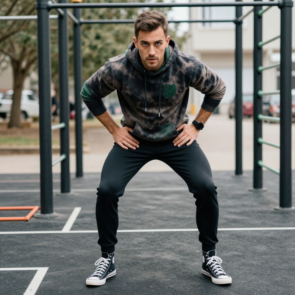 A young man with a masculine face and piercing eyes wearing a dark tie-dye hoodie with green and black accents, slim-fit black jogger pants, and high-top canvas sneakers. He is standing in a focused, dynamic pose with hands on hips in an outdoor training area with an obstacle course setup. The scene captures an urban workout environment with metal bars and fitness equipment on a black rubber surface.