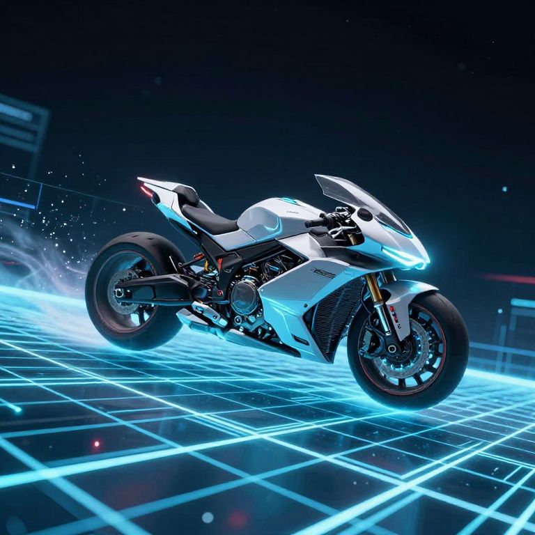 Futuristic tronbike hovering above a glowing virtual grid with bright neon circuit lines, sharp angular design with glowing accents, set against a dark starry sky, electronic particles floating around, cybernetic rider wearing sleek armor, dynamic perspective.