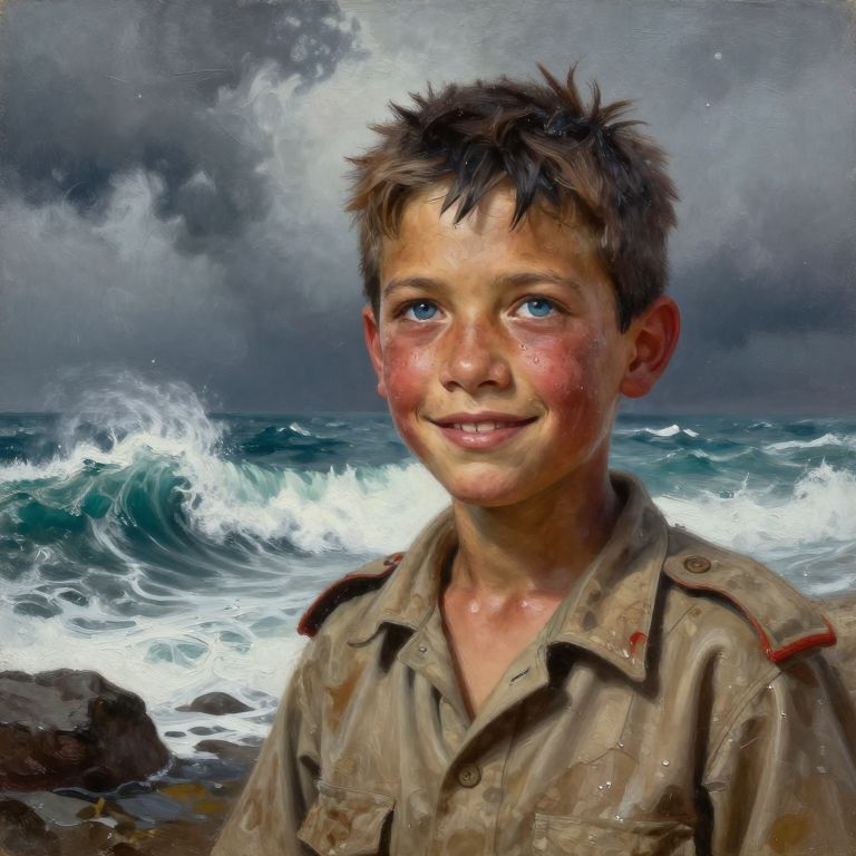 Craft a photorealistic oil painting depicting a weathered yet enthusiastic boy with rugged features and soft blue eyes amidst a stormy sea backdrop of towering waves crashing against rocky shores. Capture this scene from a low-angle perspective, as if viewed from beneath the surface, evoking awe and trepidation at nature's might. Showcase intricate details in his lined uniform, drenched in saltwater, revealing subtle signs of wear from countless journeys across vast oceans. Emphasize the intensity in his smiling gaze, reflecting resilience amidst chaos.
