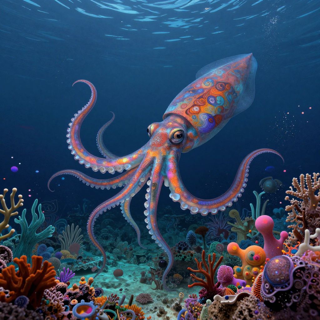 Craft an image portraying a dreamlike underwater realm, reminiscent of surrealist artistry, featuring an enigmatic colossal squid resembling a cephalopod deity. This mystical creature's tentacles elegantly weave through a captivating tapestry of vibrant hues and abstract forms, forming a surreal coral reef that exudes a sense of intrigue as it navigates the depths of this fantastical marine realm. The ethereal dance between the squid's fluid motions and the luminescent palette should evoke an emotional spectrum that transcends reality, capturing the essence of Dali-esque surrealist artistry in a mesmerizing visual symphony.