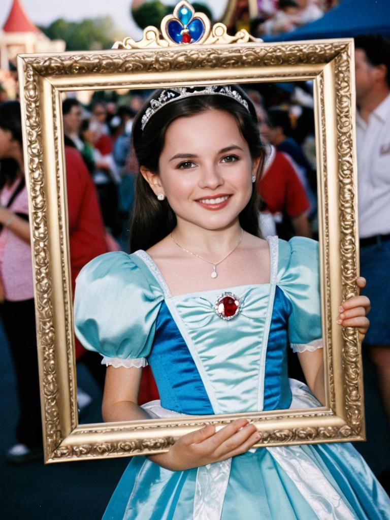 Young girl dressed as a Disney princess wearing a blue ball gown and a jeweled tiara, posing inside an ornate golden picture frame. The image captures a candid moment at a festive event, with blurred crowd and castle-like structures in the background.