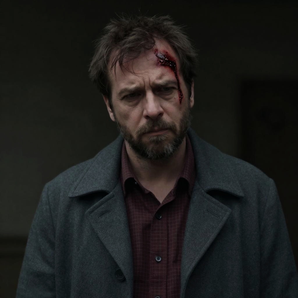 Photograph of a middle-aged man with disheveled brown hair, light skin, and a short beard. He has a bloody wound on his forehead and a slightly confused expression. Wearing a gray coat over a red checkered shirt. Background is dark and blurred.