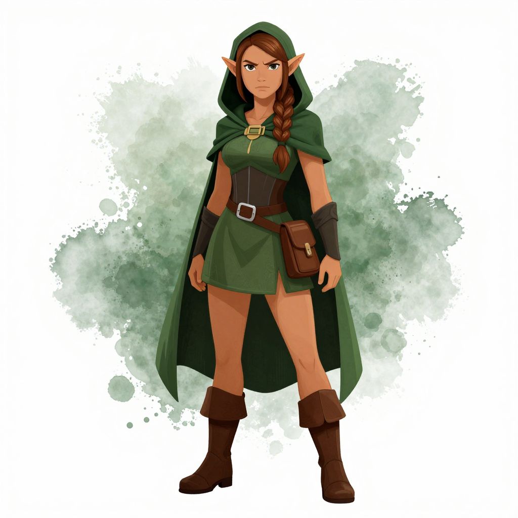 A digital drawing of a confident, fair-skinned elf woman with long, braided brown hair. She's wearing a green hooded cloak, a short green dress with a brown belt, and brown boots. Her pointed ears are prominent, and she has a serious expression. A brown satchel hangs at her side, and the background features a watercolor-like splash of green and white.
