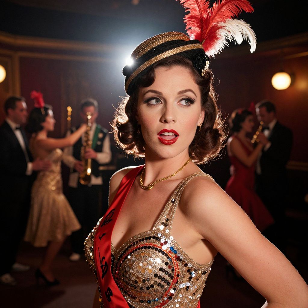 Close-up of a 1930s cabaret singer in a detailed costume — a vintage flapper dress with sequins, a red sash, and a feathered hat — standing in a spotlight within a retro-style underground club, the background showing jazz band members and dancing patrons, her face sharp and expressive, eyes focused, lips slightly parted, exuding confidence and mystery with the spotlight highlighting her radiant features.