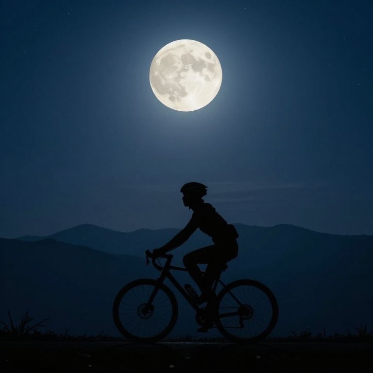Photograph of a silhouetted cyclist, wearing a helmet and casual clothing, riding a bicycle at night against a dark blue sky. A large, bright full moon dominates the sky, casting a luminous glow. The cyclist is positioned in the lower third of the image, with mountain silhouettes in the background. The scene is bathed in deep blue hues, creating a serene and mystical atmosphere. The cyclist's silhouette is sharp, contrasting against the soft, diffused light of the moon.