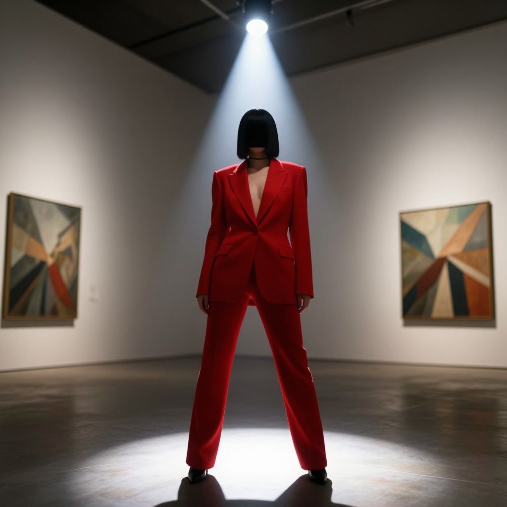 A dramatic blazer photo of a woman in a bold red blazer, standing in front of a modern art gallery, illuminated by a single spotlight, artistic lighting, sharp contrast, dynamic silhouette, fashion editorial style.