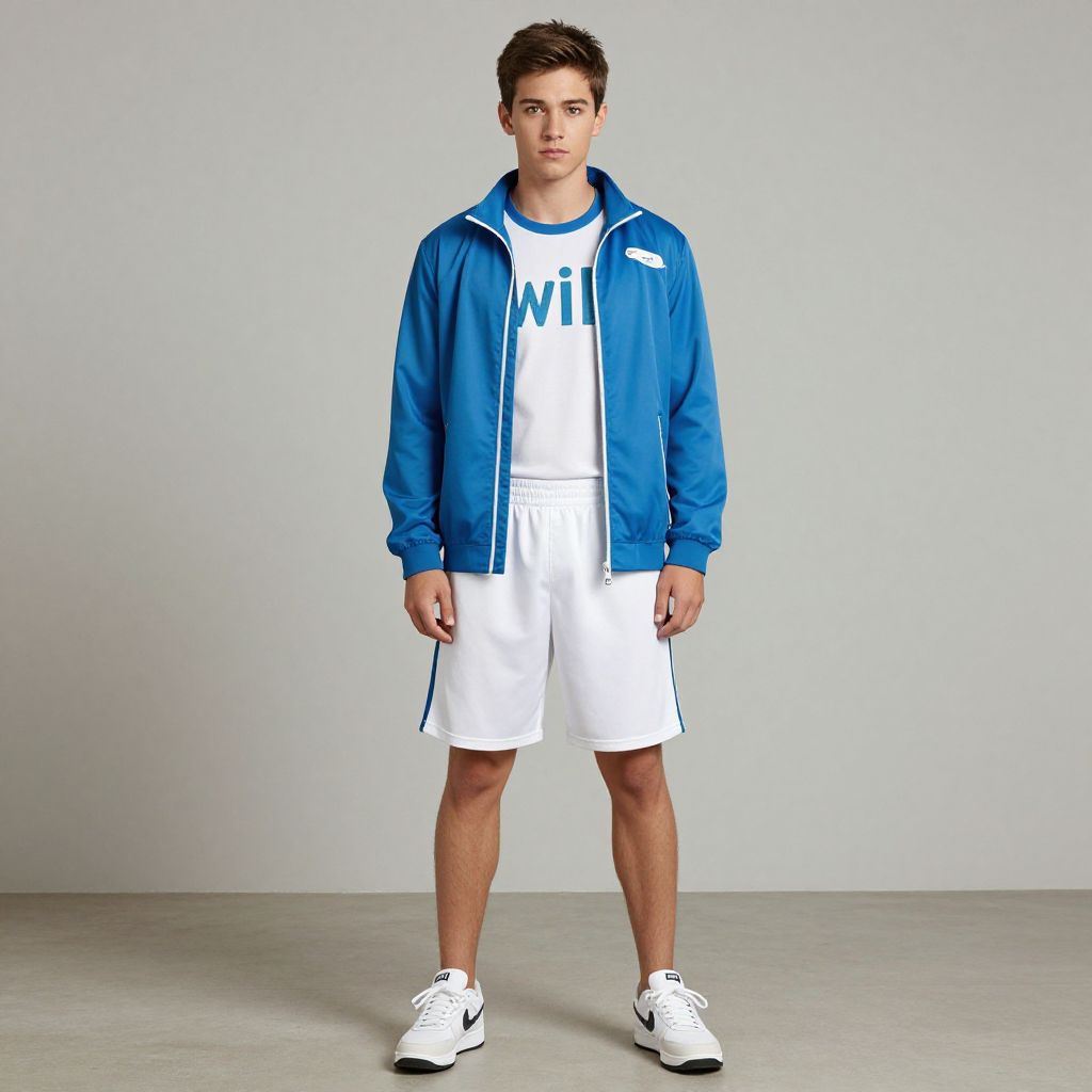 Photograph of a young man with short dark hair, wearing a blue and white athletic jacket, white shorts, and white sneakers, standing against a plain