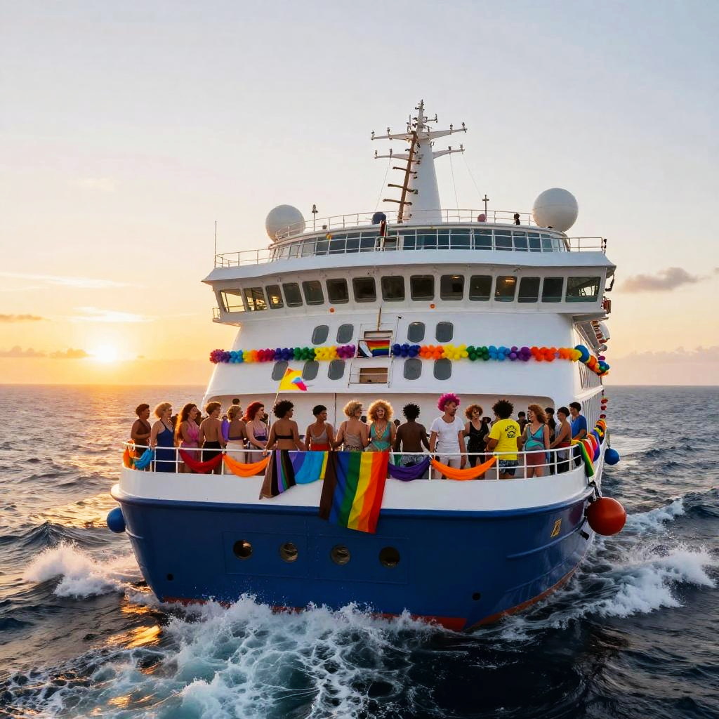 Transgender cruise party on a large cruise ship deck, people in expressive fashion and colorful outfits, dancing under string lights, panoramic ocean view, festive decorations with pride symbols, energetic and welcoming environment, high detail.
