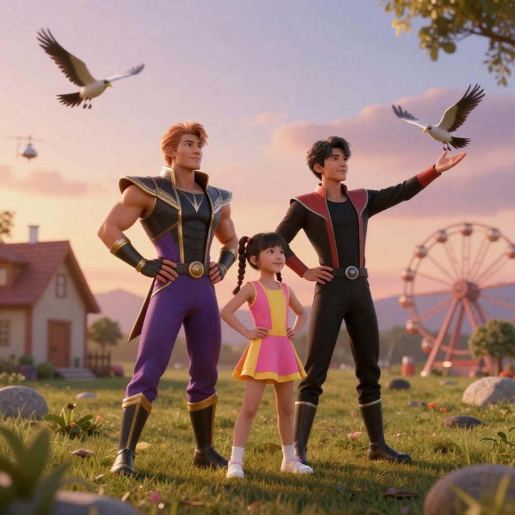 Three characters stand on grass at sunset. Muscular man in black, purple, and gold outfit, with hands on hips. Young girl in pink and yellow outfit, with hands on hips. Young man in black and red outfit, with arms outstretched, birds flying from his hands. Background: colorful sky, house on left, Ferris wheel on right, helicopter in sky, trees.