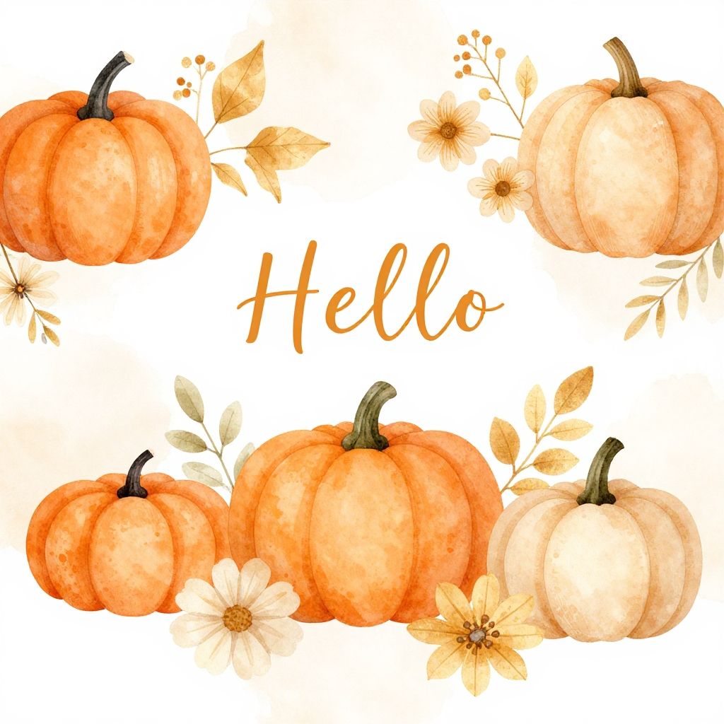 Hello pumpkin wallpaper with an artistic watercolor style, depicting an arrangement of assorted pumpkins in shades of orange and cream, intertwined with delicate autumnal flowers and golden leaves, offering a soft and elegant seasonal backdrop.