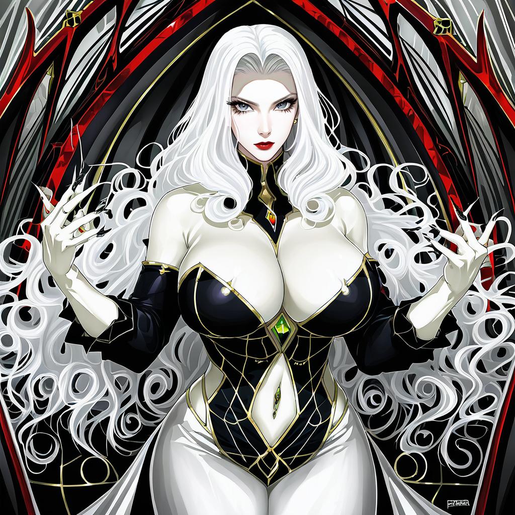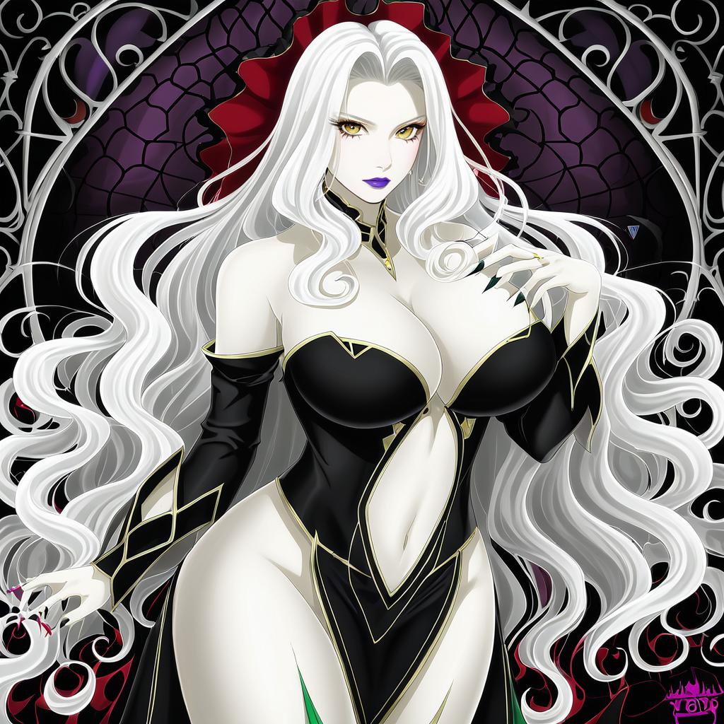 Carmilla (fate), fate (series), 1girl, yellow eyes, long hair, white hair, curly hair, grey hair, large breasts, cleavage, thighs, navel, bare shoulders, nail polish, long fingernails, by artist gibagiba, anime