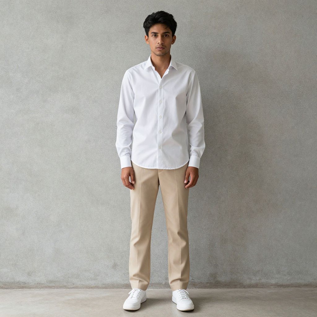Photograph of a young man standing against a plain, light gray concrete wall. He has short, dark curly hair and a neutral expression. He is wearing a crisp, white long-sleeve dress shirt with the sleeves rolled up slightly, paired with blue jeans that have a slight fade and a black belt. His shoes are clean, white sneakers. The concrete wall behind him is smooth with visible seams. The ground is a simple gray concrete surface. The image has a slightly over-saturated, almost cartoon-like quality, with vivid colors and sharp contrasts.
