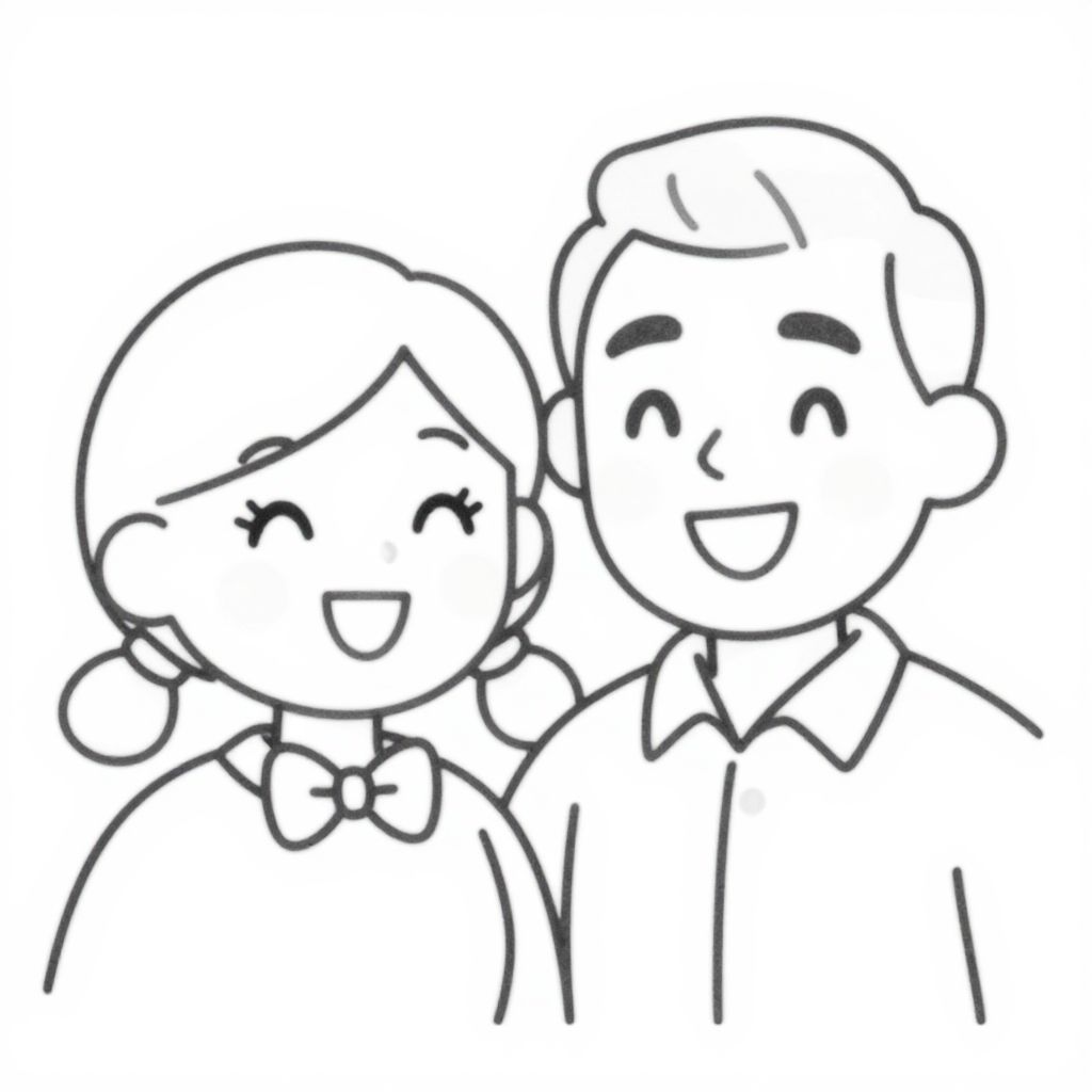 Grandparents Day coloring page featuring a cheerful illustration of two smiling adults, a woman with her hair styled in pigtails wearing a bow tie and a man with neatly combed hair dressed in a collared shirt, both exuding warmth and joy.