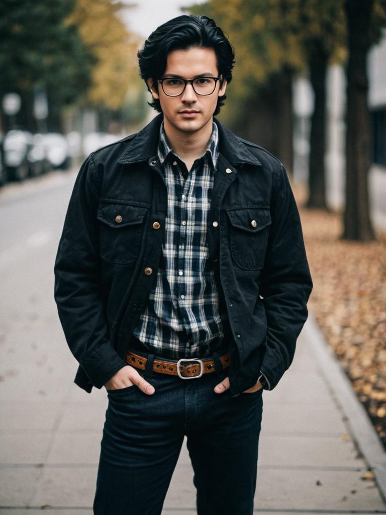 Working clothes styles, 1boy, male focus, solo, blurry background, shirt, pants, outdoors, blurry, black hair, motor vehicle, belt, collared shirt, looking at viewer, pocket, hands in pockets, day, helmet, blue shirt, road, wristwatch, watch, cowboy shot, brown pants, breast pocket, standing, car, street