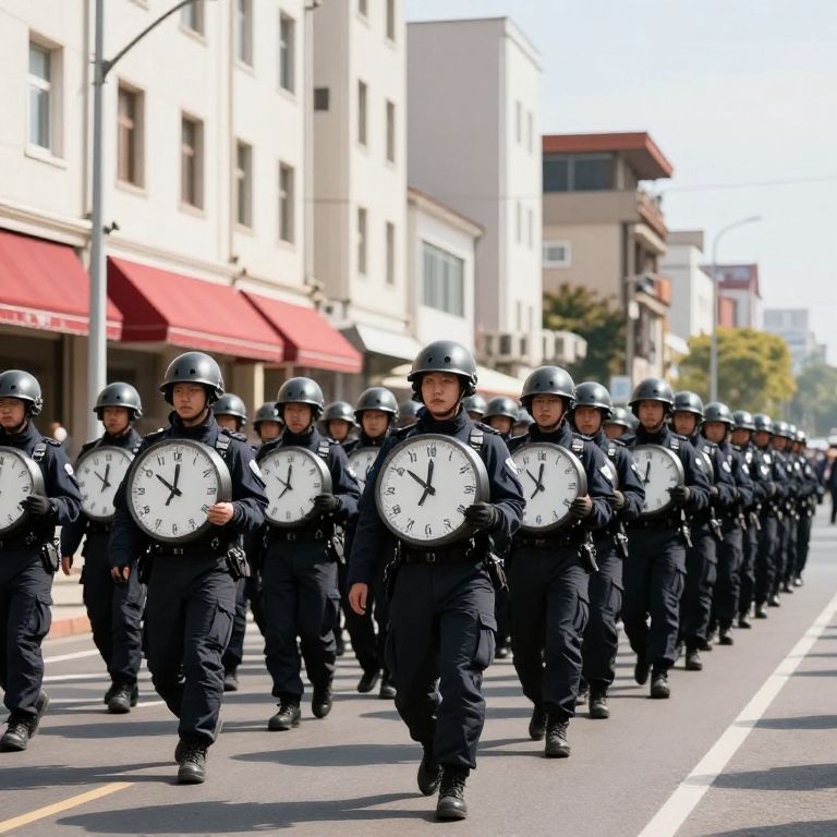 Rows of uniformed individuals clad in dark gear and helmets march in formation down a sunlit urban street, each holding large clocks with white faces and black hands, creating a surreal juxtaposition against the backdrop of tall, evenly spaced buildings and red awnings.