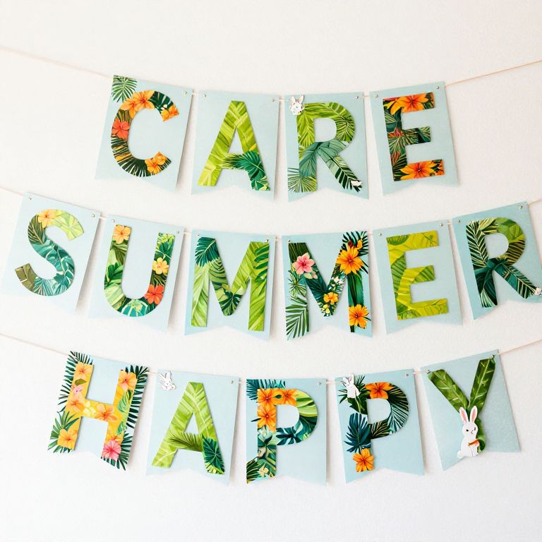 Brightly hued tropical banners spell out \"CARE,\" \"SUMMER,\" and \"HAPPY,\" adorned with whimsical bunny cutouts and vibrant floral patterns, creating a surreal and enchanting summer celebration.