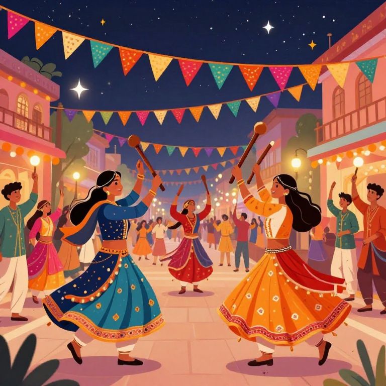 Navratri festival illustrated as a dynamic street celebration with dancers swirling in colorful garments, wooden sticks clashing rhythmically, festive banners waving overhead, and a sense of communal joy enveloping the lively crowd under starry skies.