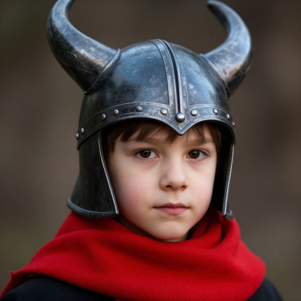 Photograph of a young child with fair skin and dark brown eyes, wearing a shiny black metal Viking helmet with large curved horns and small rivets, and a bright red wool scarf. The child's expression is neutral, with slightly parted lips and soft light reflecting on their face. The background is blurred, featuring dark, earthy tones, drawing focus to the child's face and helmet. The child's dark brown hair peeks out from under the helmet. The image has a realistic, detailed style, highlighting the textures of the metal helmet and wool scarf.