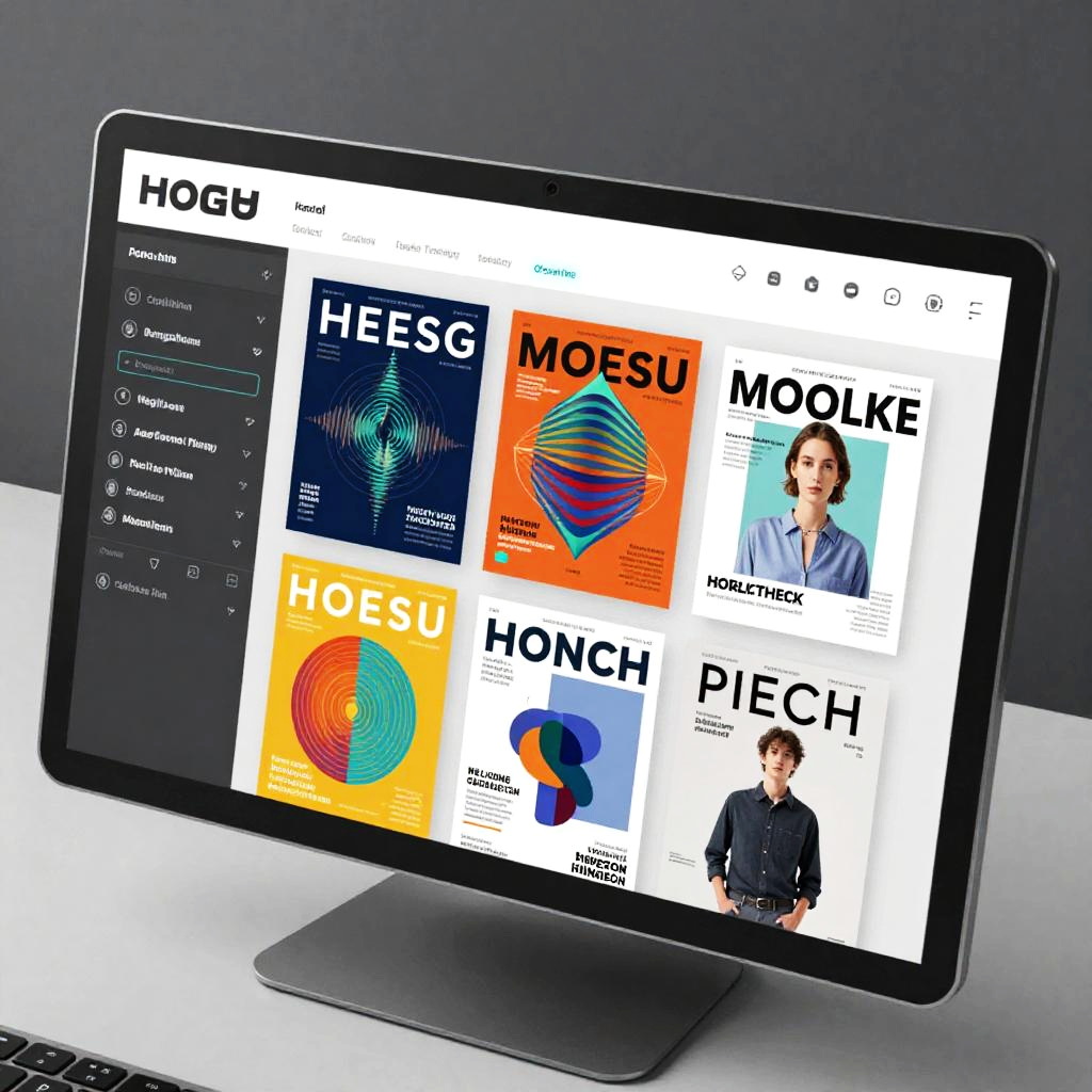 An AI magazine maker interface displaying dynamic layouts of colorful, innovative magazine covers and editorial designs, featuring abstract data streams and futuristic UI elements in a high-tech design studio environment.