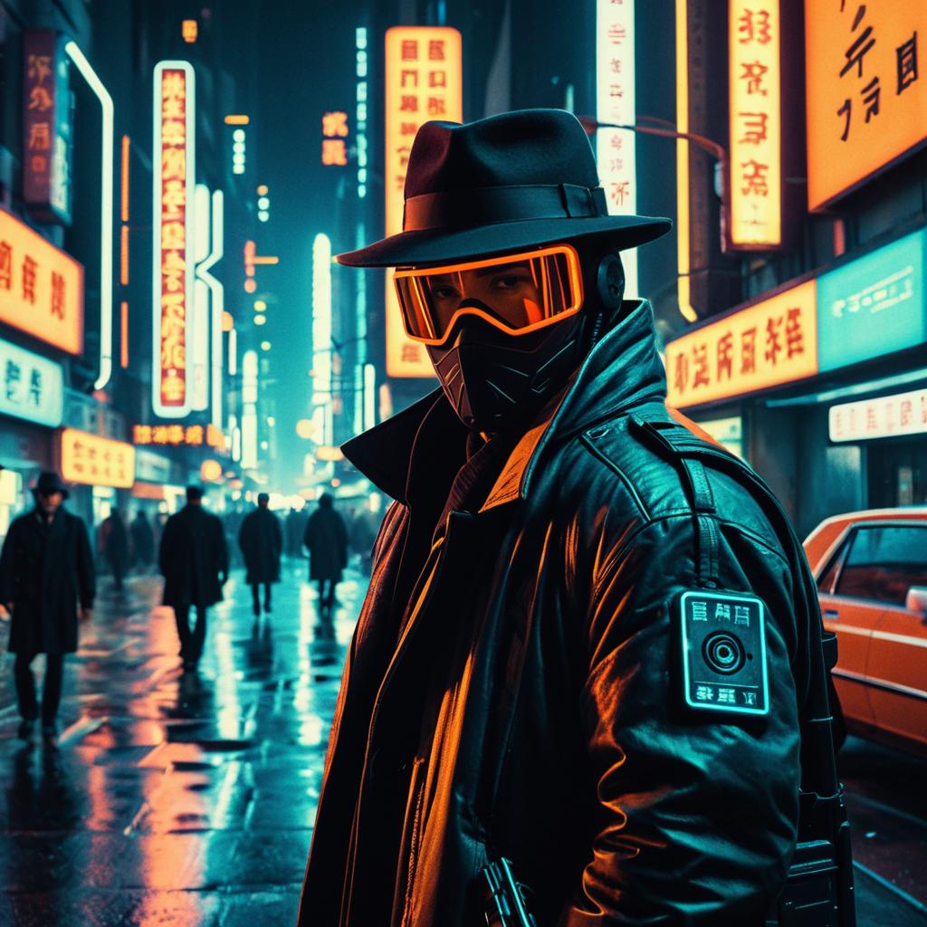 Resize movie poster of retro sci-fi film by H.R. Giger, cybernetic detective with glowing eyes, rain-soaked neon-lit streets, depth of field, 1970s style sci-fi, ambient lighting, light-orange, 2001: A Space Odyssey film style, DOF