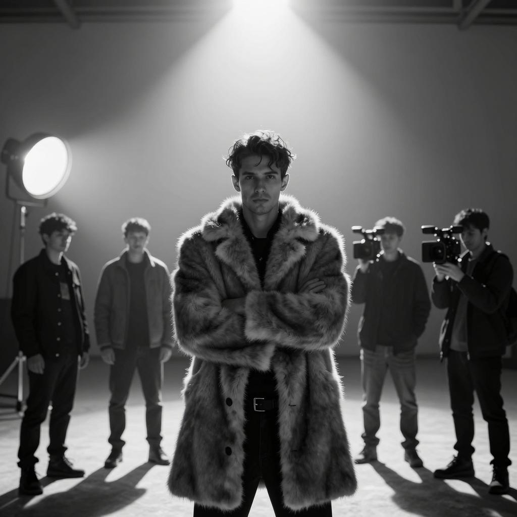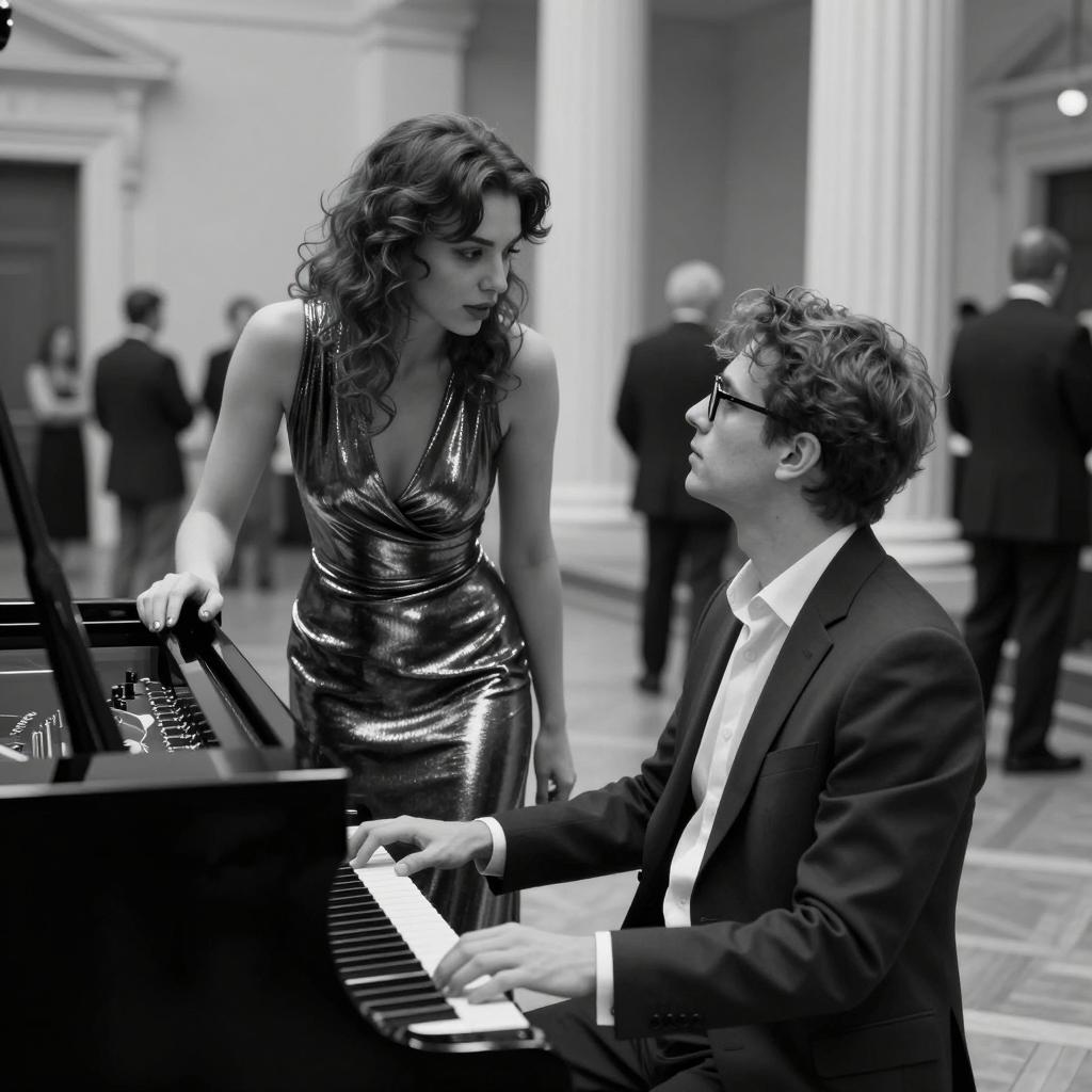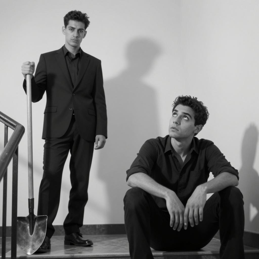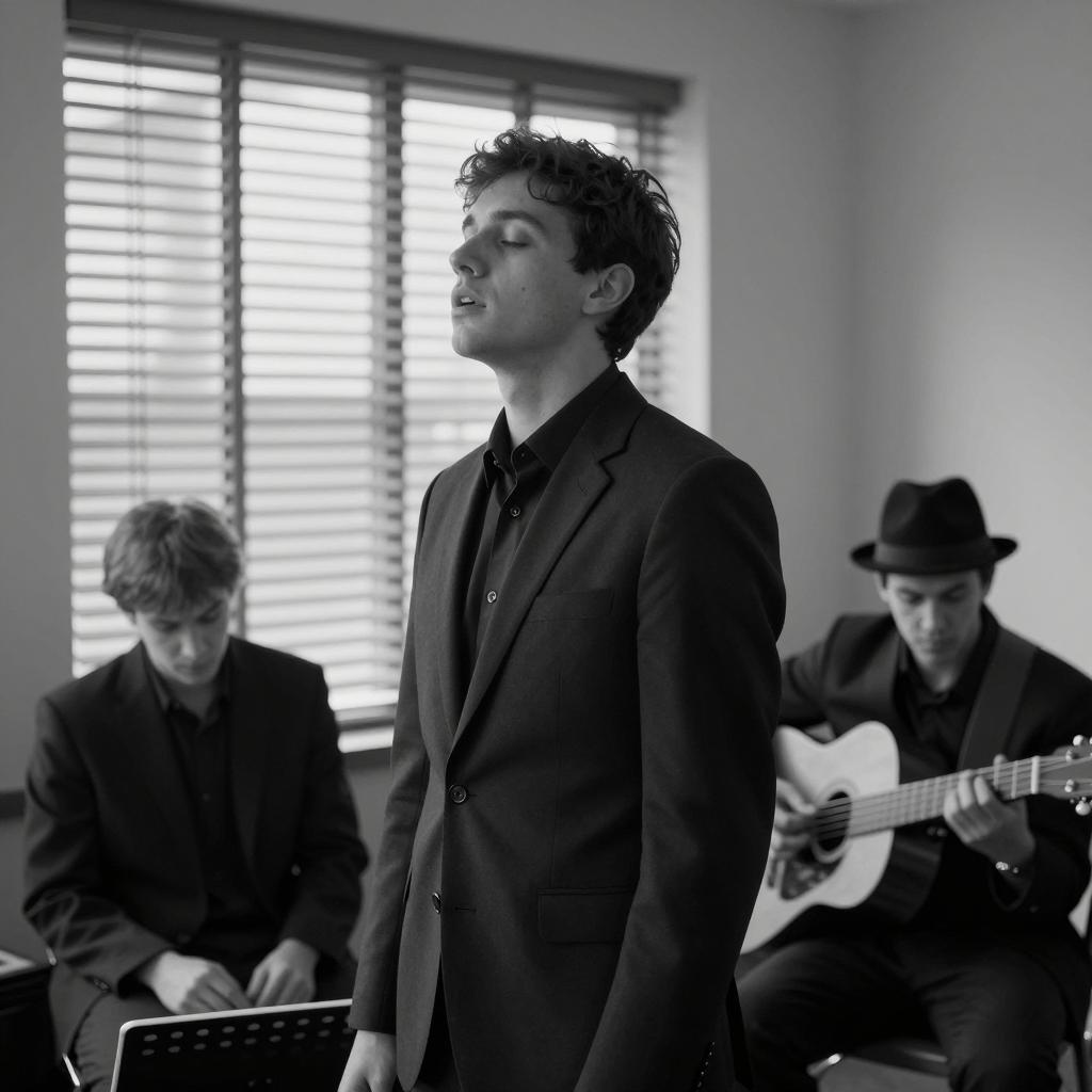 Black and white photograph of three young men in formal dark suits performing music indoors. The primary subject stands with closed eyes and open mouth, appearing to sing passionately. Behind him, one man is seated playing a guitar wearing a dark hat, and another man is seated playing a keyboard. Window blinds cast shadows in the background, creating a moody atmosphere.