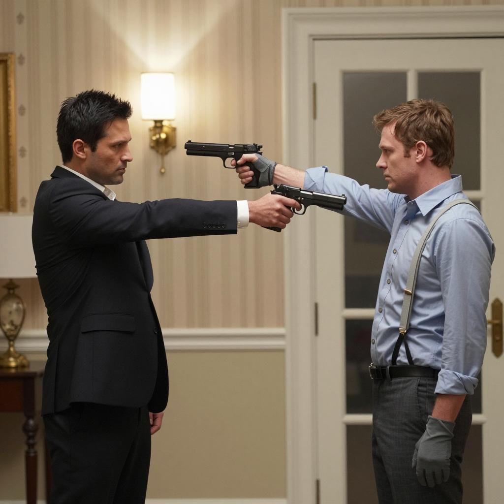 Two serious men standing outdoors near old stone ruins. The man in front wears a black suit with a tie and holds a handgun. The second man in the background wears a blue shirt and gray pants. The scene features a stone wall with an arched entryway and grass-covered ground in warm daylight.